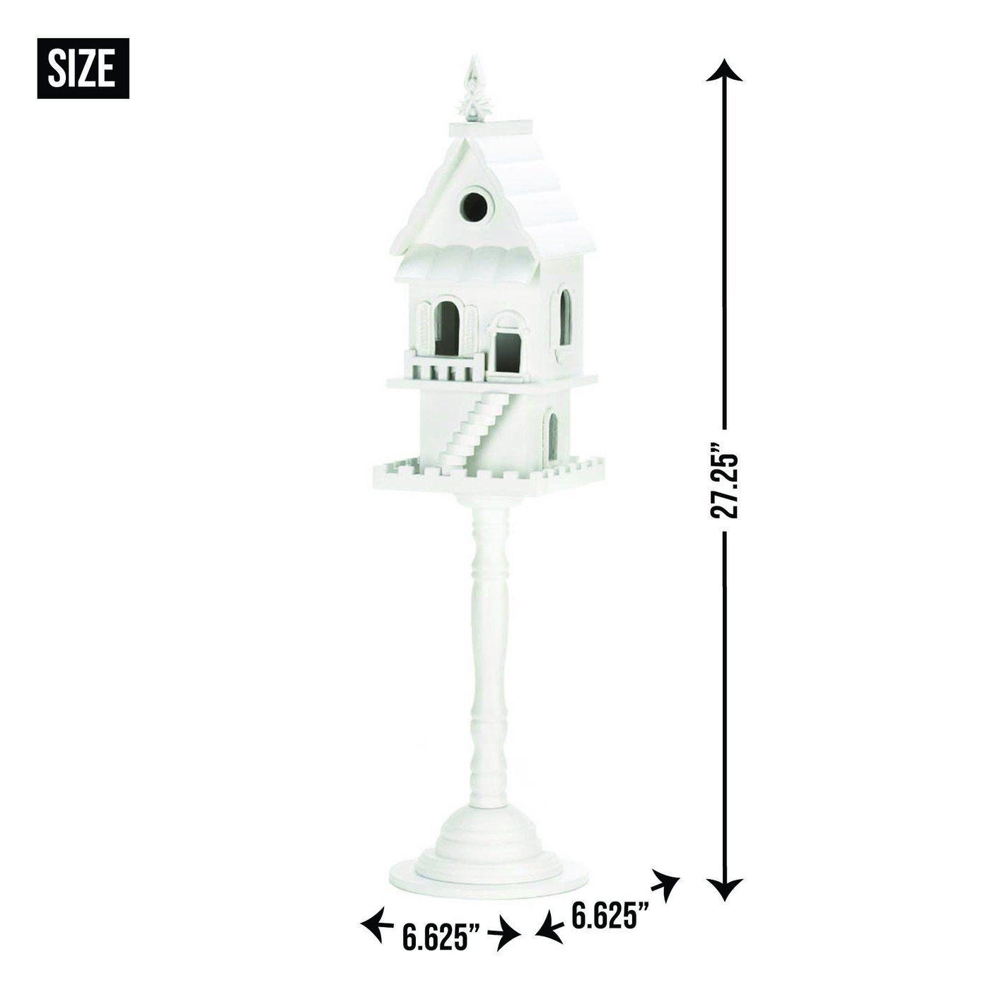 • Give the birds a grand home to call their own with this gorgeous white birdhouse. Its charming features include a front staircase, multiple entrances, two separate floors, a turned pedestal stand, and top decorative finial.